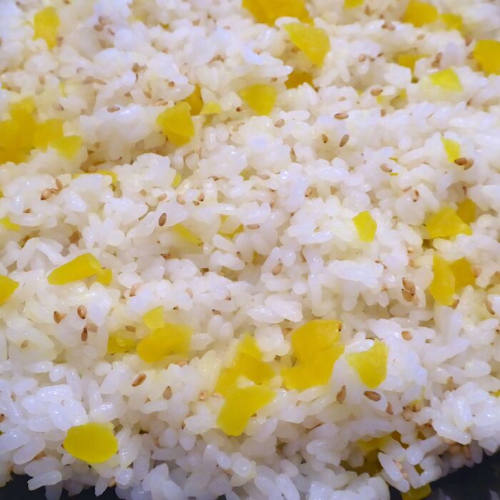 ご飯にすし酢を合わせて刻んだ沢庵、白ごまを混ぜます。