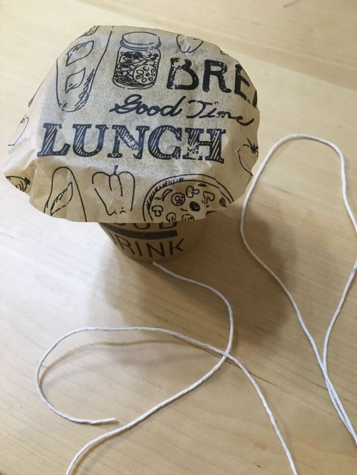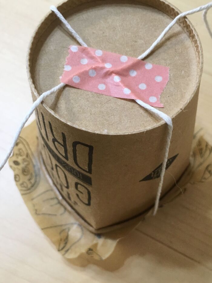 4,逆さまにして、紙コップの底で紐を交差します。そこをマスキングテープで留めます。