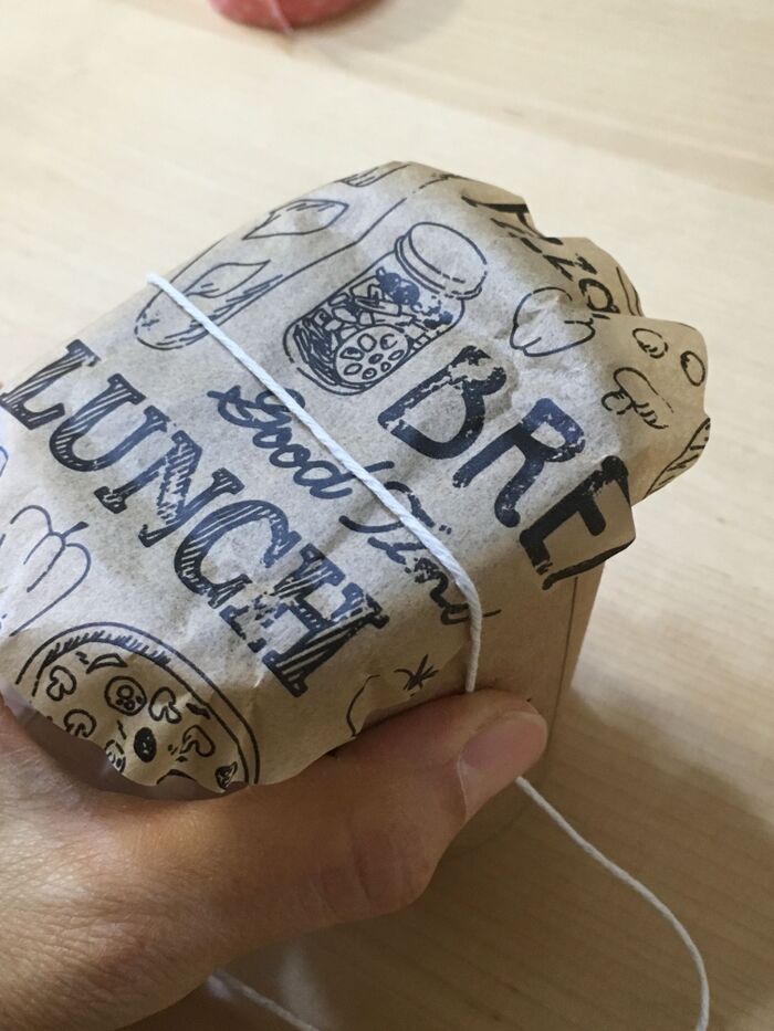 3,紐の真ん中を持ち、写真のように、おかずカップの中央に置き、下まで紐を引っ張ります。