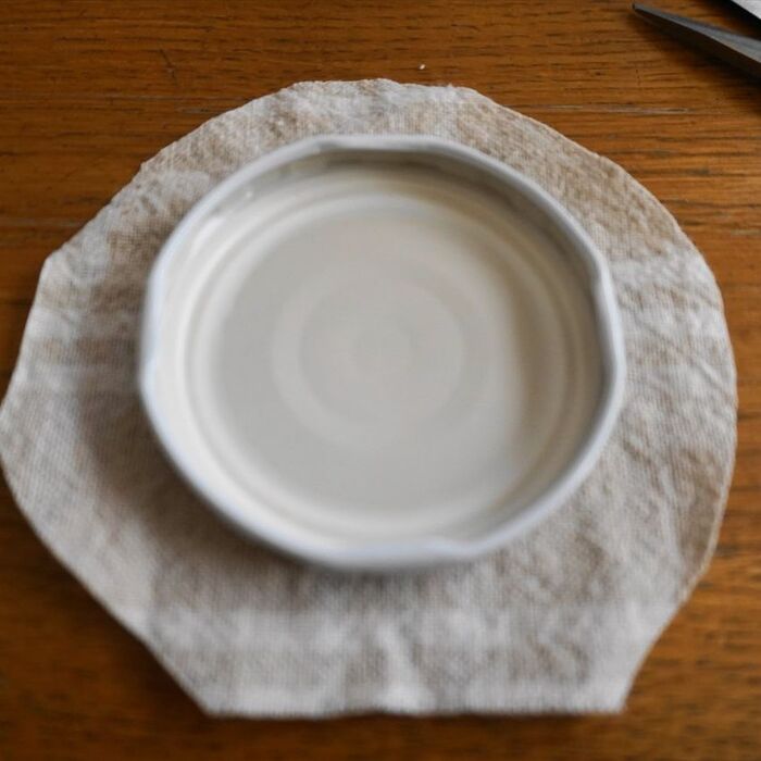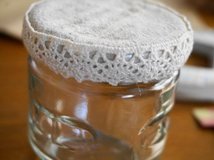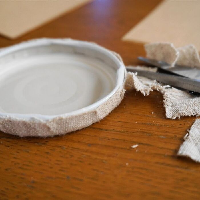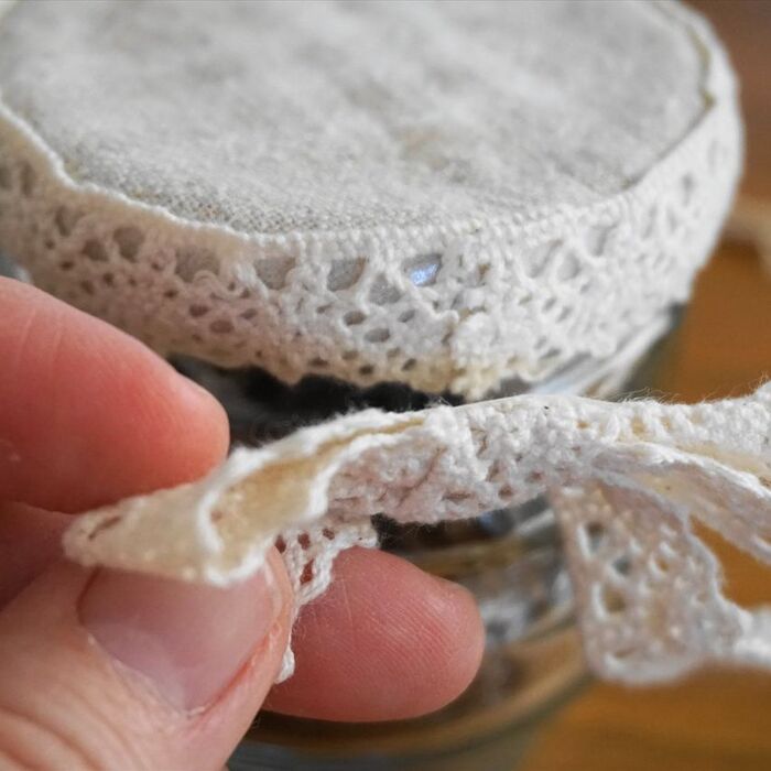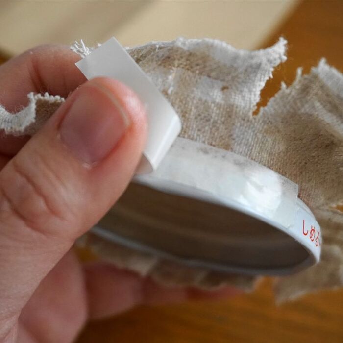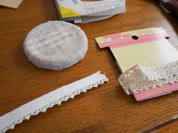蓋を1周プラス1cmの長さにレースをカットして両面テープを貼ります。