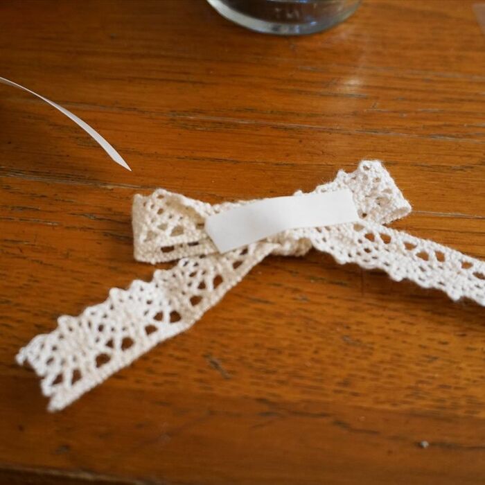 側面につけたレースの橋を隠すようにリボンを貼り付けます。
