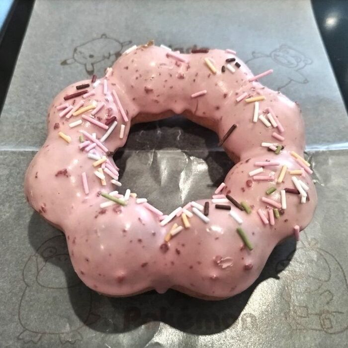 甘酸っぱいストロベリーチョコともちもちポン・デ・リングに、カラーシュガーが華やかで、クリスマスにぴったり♡子供も絶対好きな味だと思いました。