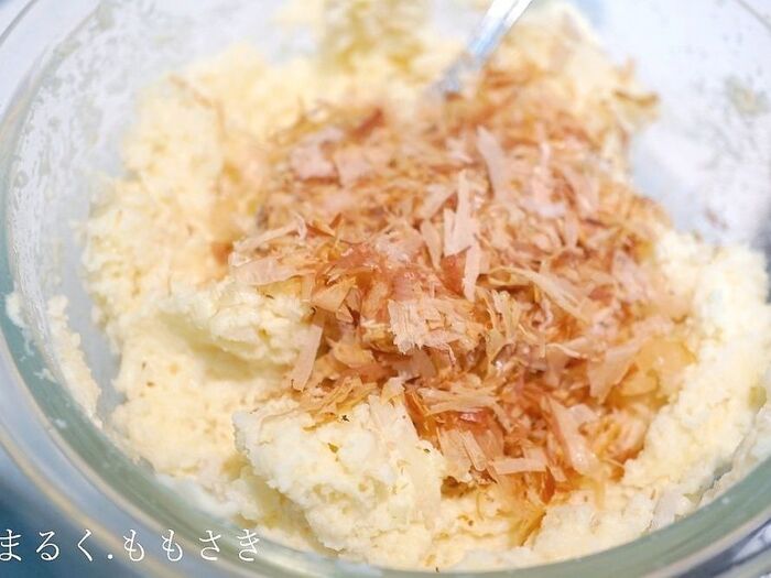 ⑤かつお節を入れ全体を混ぜ塩で味を調える。