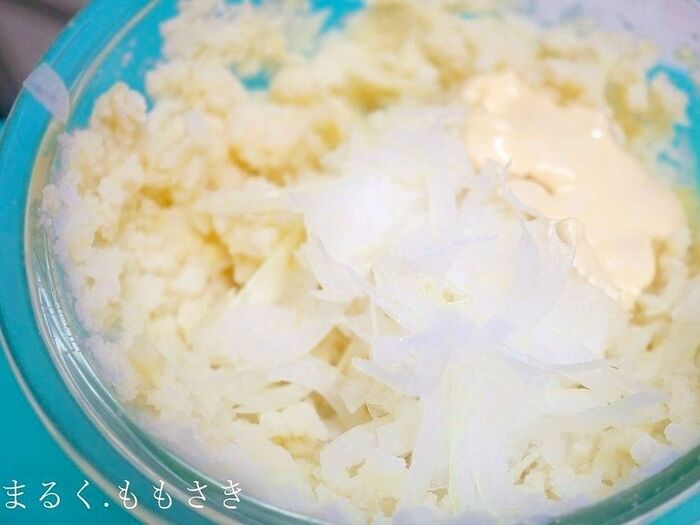 ①玉ねぎはスライサーにかけ水に5分程つける。※じゃがいもは圧力鍋で蒸したのを使いました。