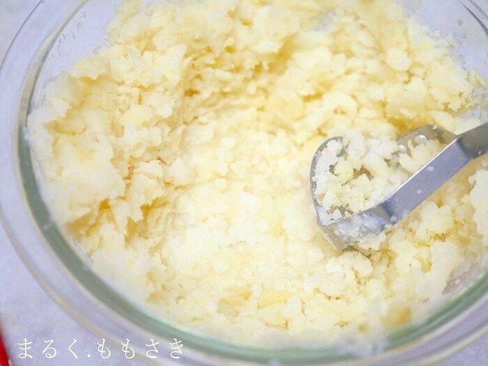③皮を剥きボウルに入れマッシャーなどで潰し★を入れ混ぜる(100均のマッシャーです)。