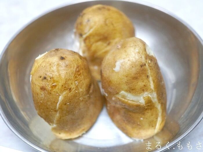②じゃがいもをレンジでする場合、濡らしたペーパーで丸ごとのじゃが芋を包んだあとラップを被せる。100gに付き2分半程。もしくはカットして茹でてもオッケーです。
