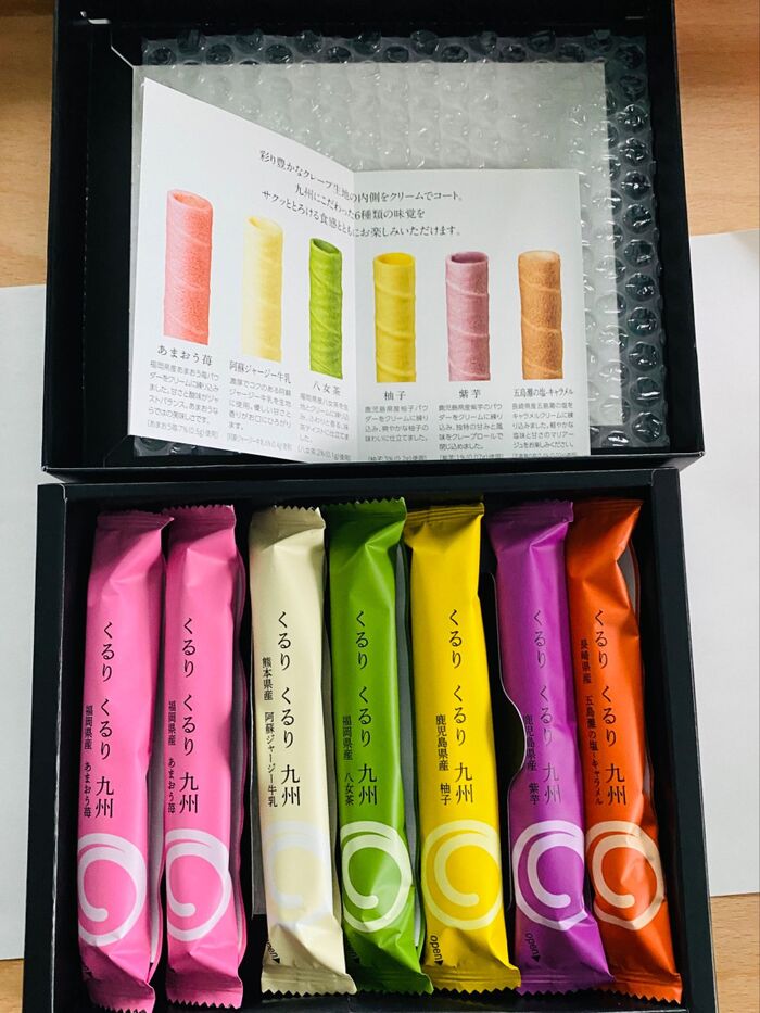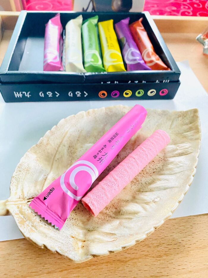 ピンクは福岡県あまおう苺の香りがしていて、甘さ控えめで軽いお菓子です。