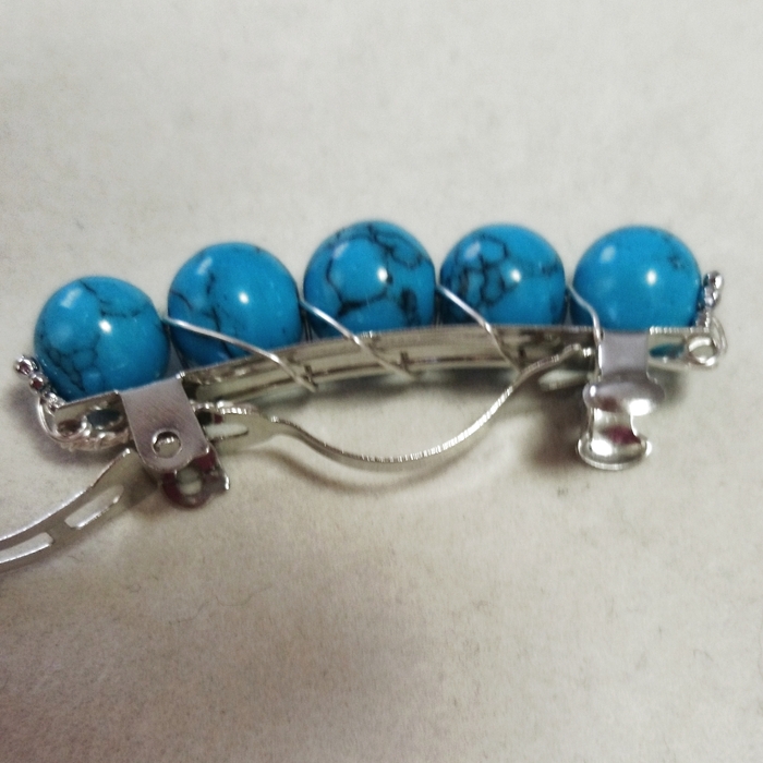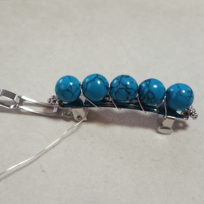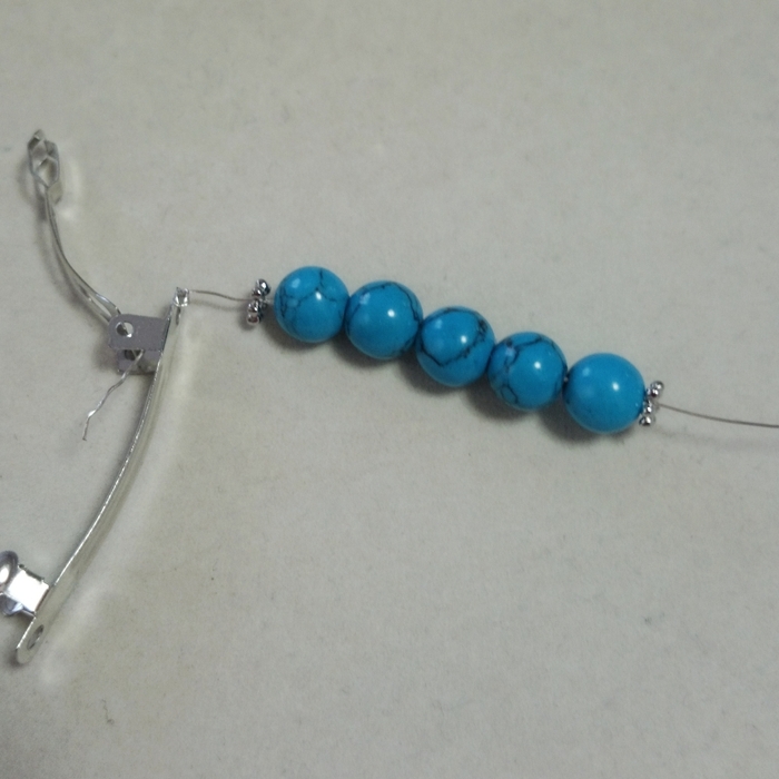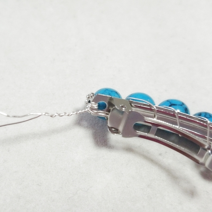 その後、ターコイズの間にワイヤーを巻き付けながらバレッタに固定していきます。
