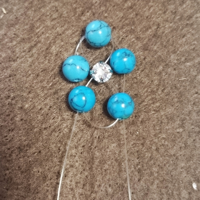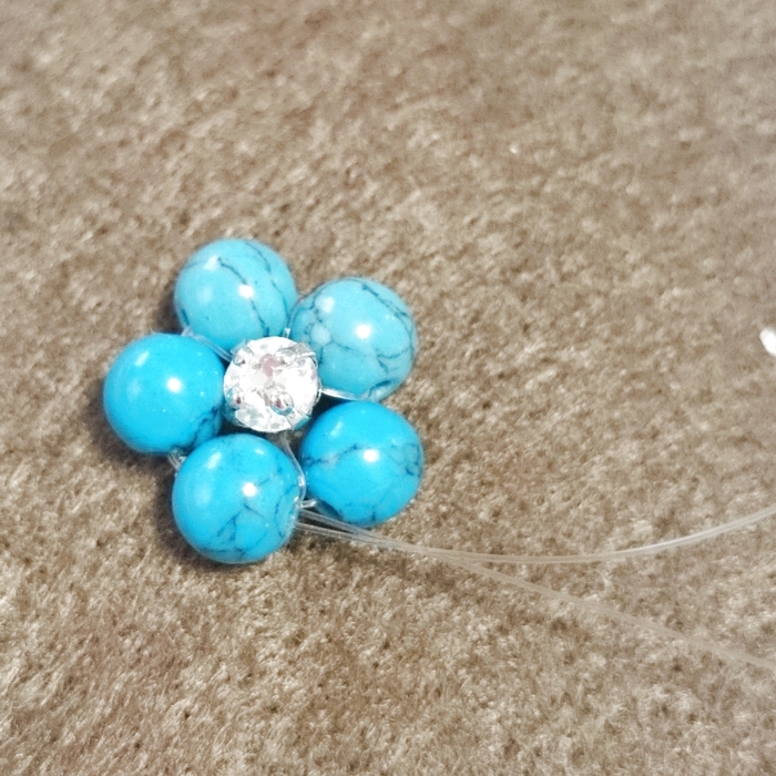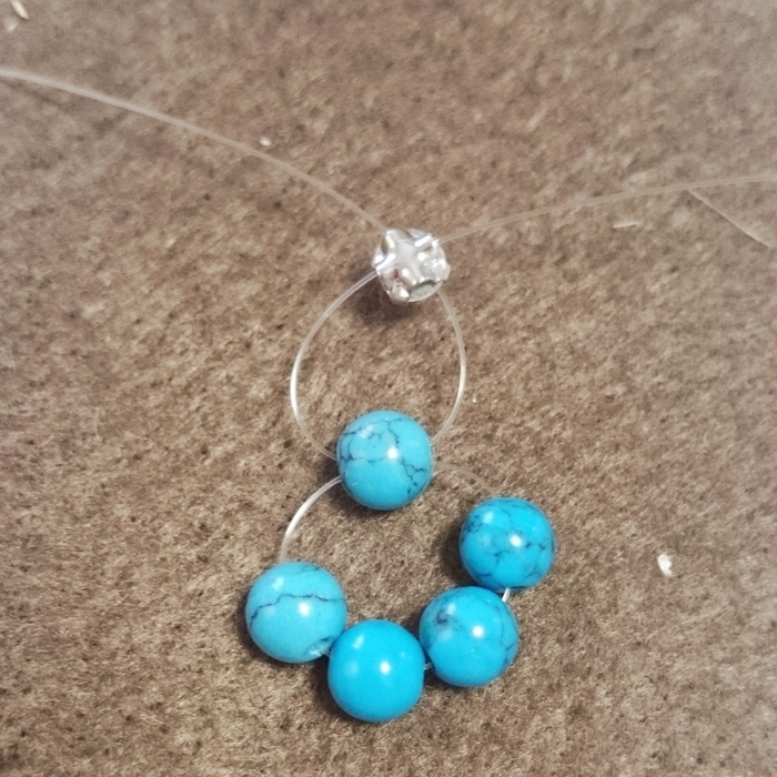 テグス20センチターコイズ6ミリを5つ通し、最後のターコイズでテグスを交差させます。この時ビーズがテグスの真ん中にくるようにします。