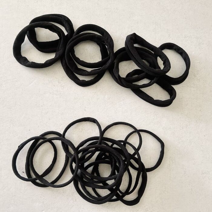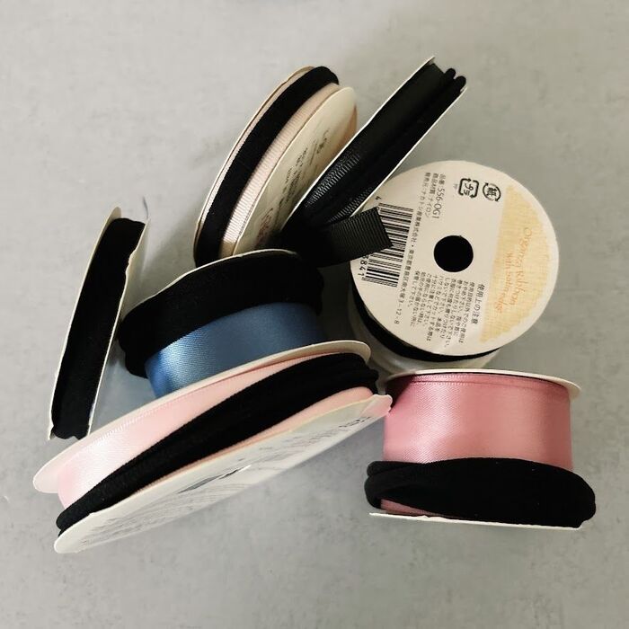 使いかけのリボンがぐちゃぐちゃにならないように輪ゴムで留めていたら、いつの間にか輪ゴムが劣化してちぎれるんですよね。