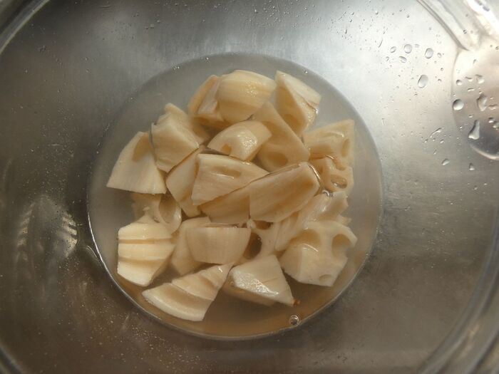 れんこんは乱切りにして水につけます。水切りしたら電子レンジ600wで1分半加熱します。