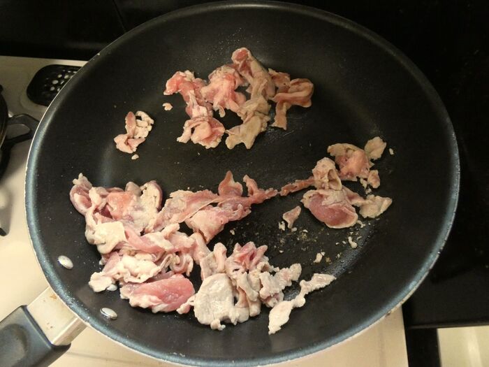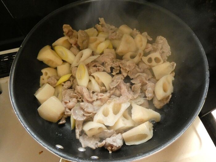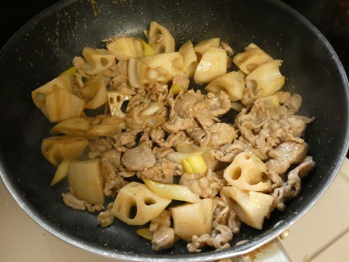色が変わってきたら、れんこんと長ねぎを入れて炒めます。