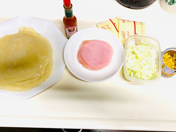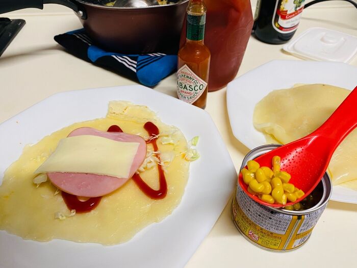 ④③にトマトケチャップをかけ、せん切りキャベツ、ハム、スライスチーズ、水気を切ったホールコーンを乗せます。