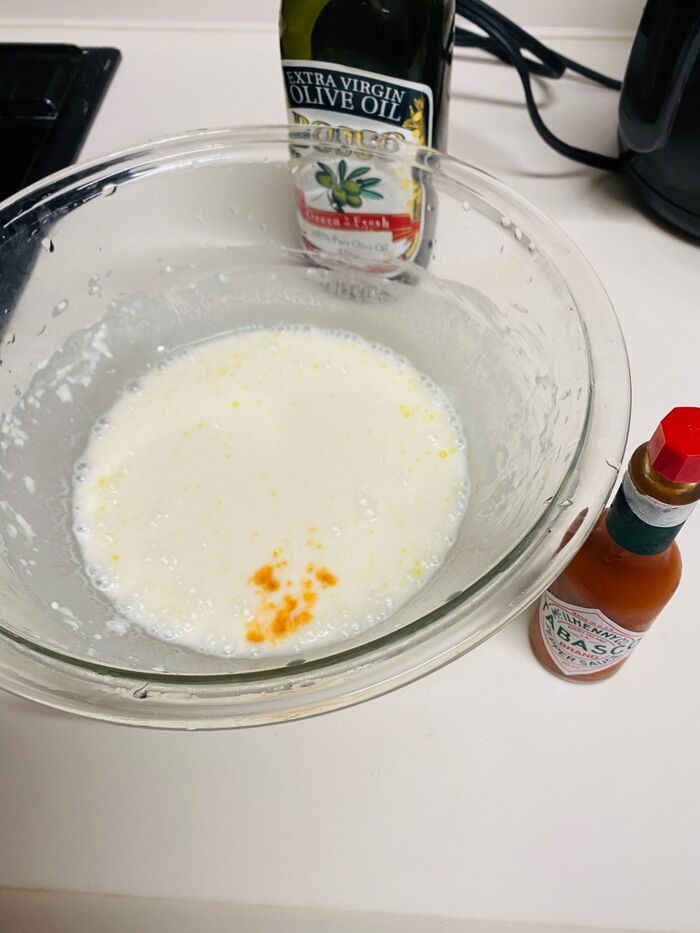 ①ボウルに、振るった小麦粉、水を入れよく混ぜます。オリーブオイル、塩胡椒、タバスコを入れ混ぜます。15分ぐらい生地を常温で休ませます。