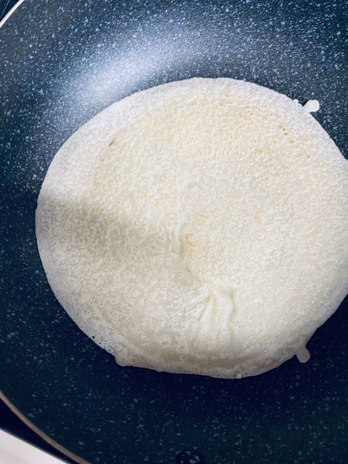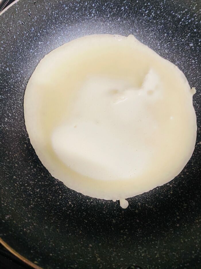 ②フライパンを熱し、油をキッチンペーパーなどを使って薄く塗ります。お玉で①の生地を入れ、お玉の底を押し当てて、薄く伸ばしていきます。