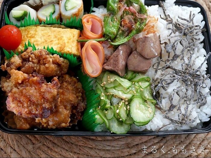 チーズ入り卵焼き・ハムマヨ(ハムも焼いて冷ましてから使います)・きゅうりの酢の物・しし唐の焼いたの・レバー煮込み・カレー風味の唐揚げ・トマト。