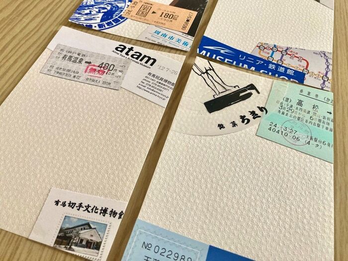 お菓子の包み紙や駅スタンプなど、全体は入れずに一部分を切り取るのがポイント。