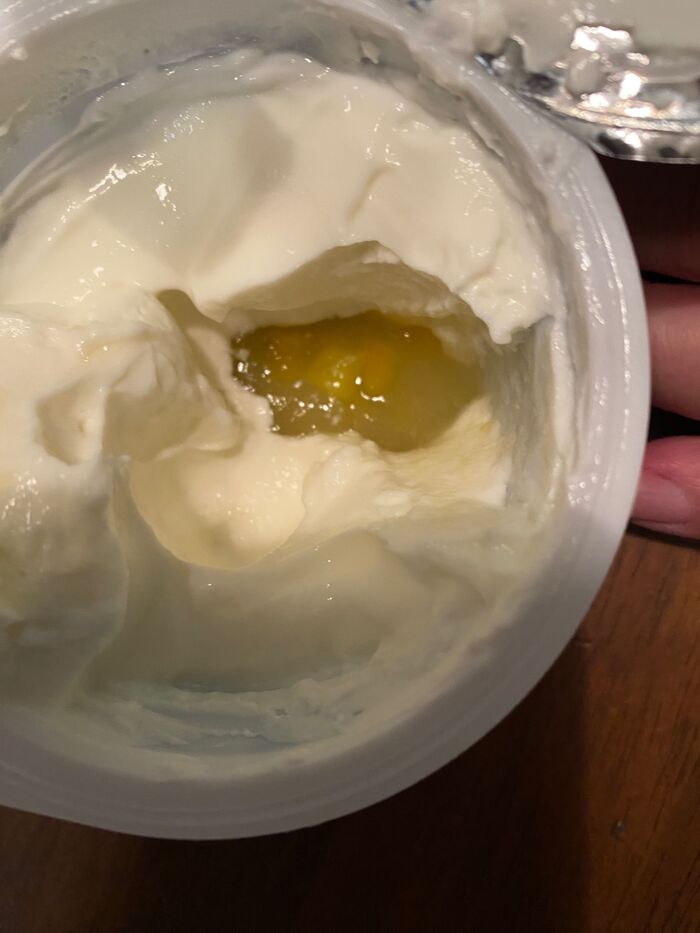 白いヨーグルトの下に、マンゴージャムが入っています。