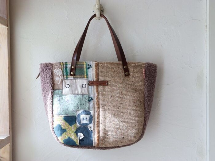 こうして出来上がったパーツを使って完成したのがこちらのトートバッグ。まるでこのまま1枚の生地だったかのように、小さな布のカケラが生まれ変わりました。