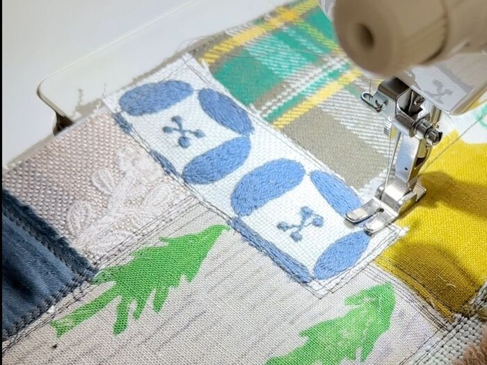 真っ直ぐ縫わずに揺らぎながら縫い繋ぐことで、布カケラとミシンステッチがいい感じにマッチして世界でたった一つのオリジナルバッグが完成です!
