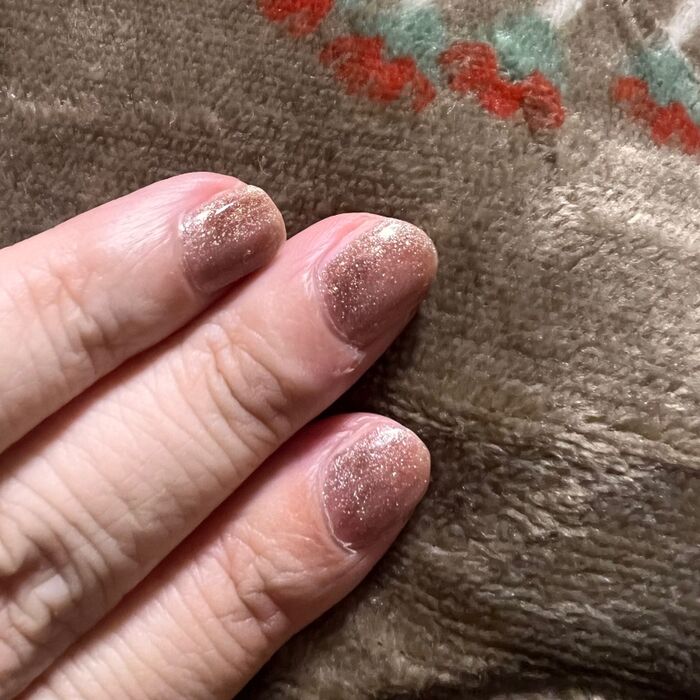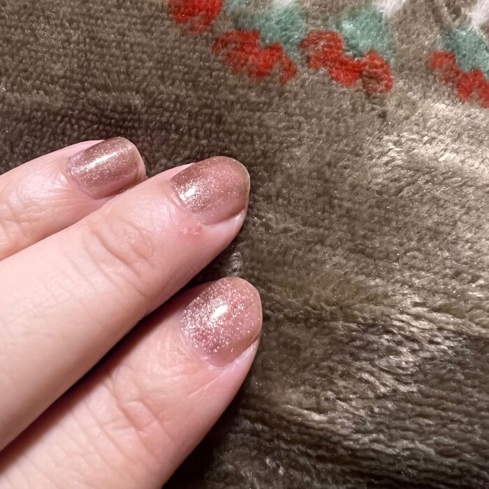 親指に光をあてて1分ほど、他の指はまとめて、光を当てて1分ほどで固まりました。2度重ね塗りをして光を当てたので、合計4分ほどで片手のネイルが乾きます。
