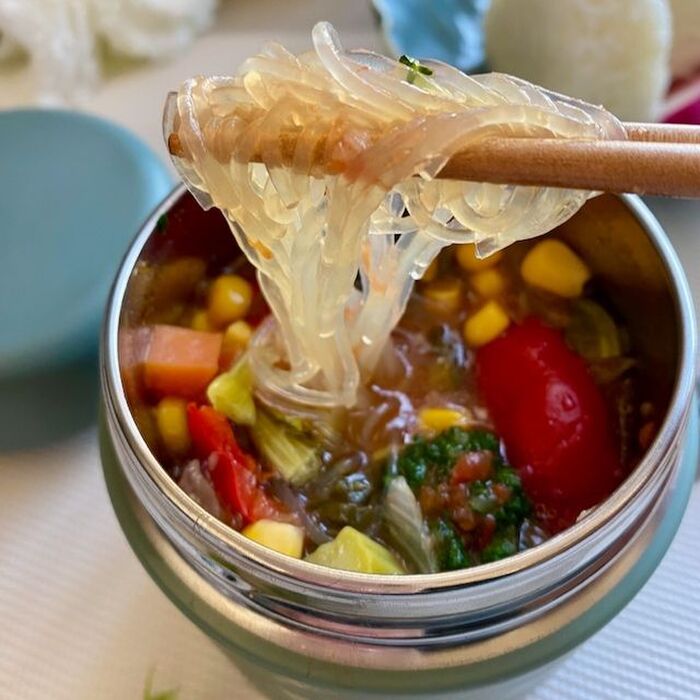 スープジャーを温めるために入れた熱湯をすて、春雨をそのまま入れ熱々のスープを具材と共に注ぐ。