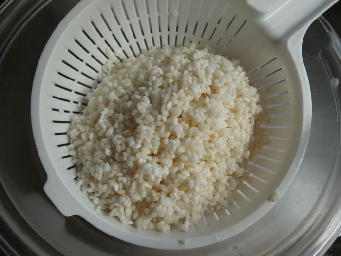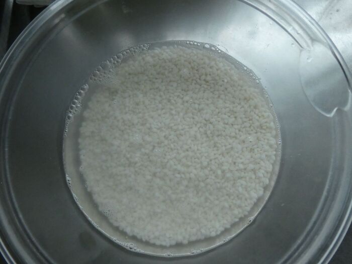 もち米をボウルで一晩水につけておきます(もち米はもちつき機の浸すボタンがあればそれでもOK)。