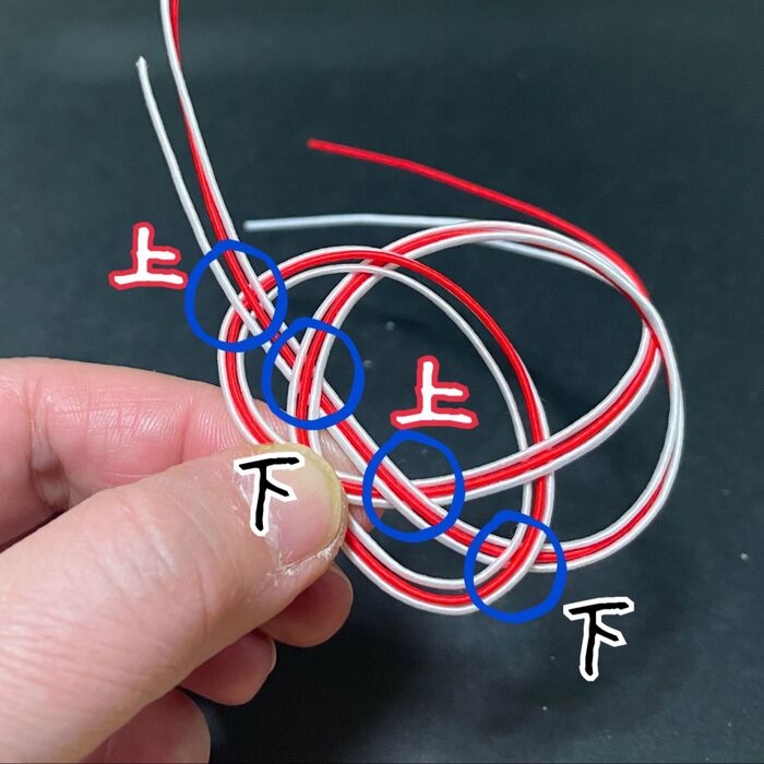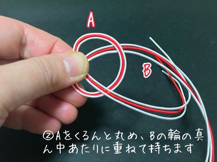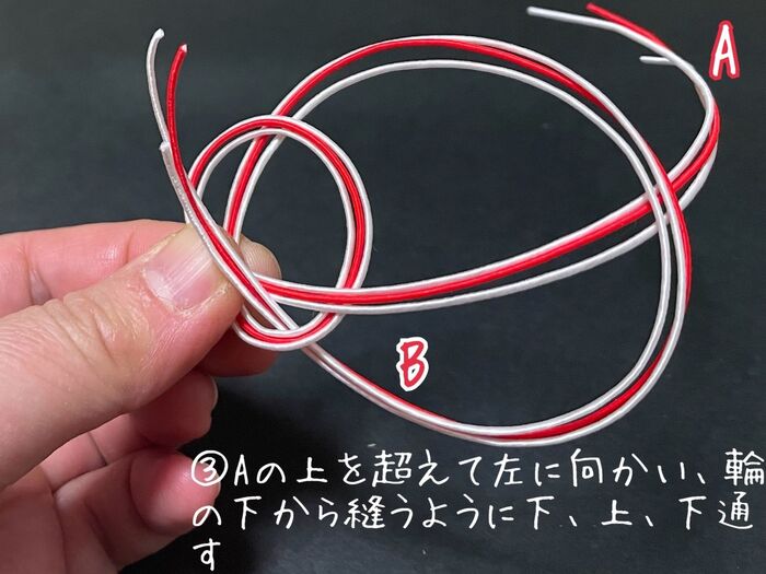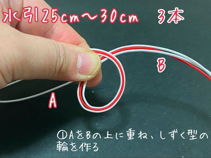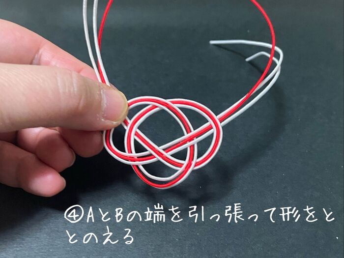 水引きの紅白を25〜30cmを3本用意して、①〜④に沿ってあわじ結びを作ります。