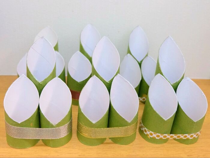 ペーパー芯を4本使って、シンプルな門松を作りました。ペーパー芯や牛乳パックなど捨ててしまう材料を使って手軽に作れます。