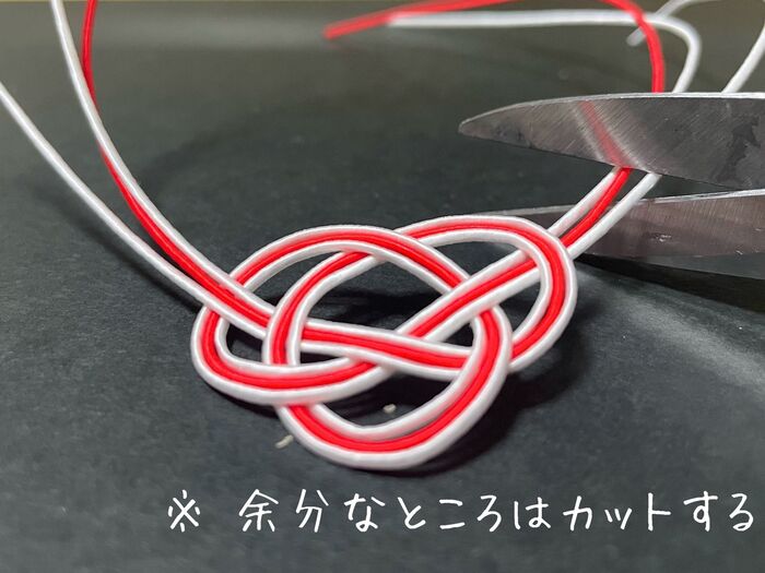 あわじ結びが完成したら、形を整えて、正面に接着しましょう。