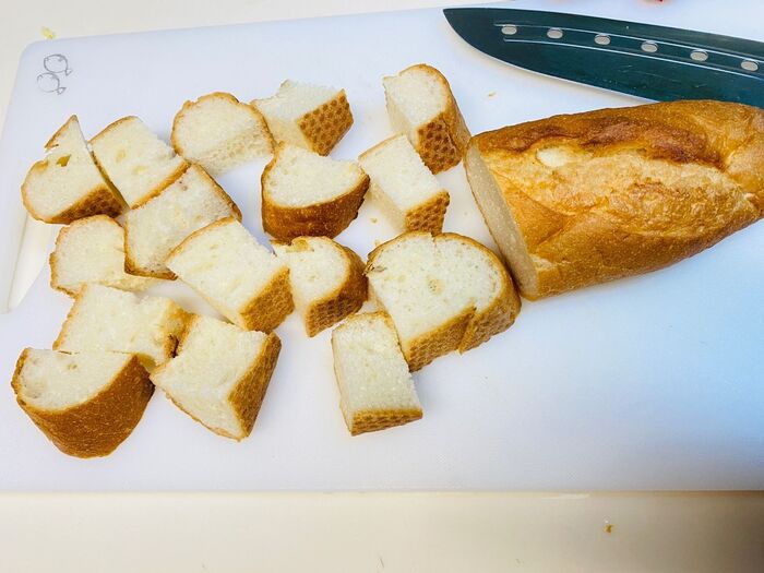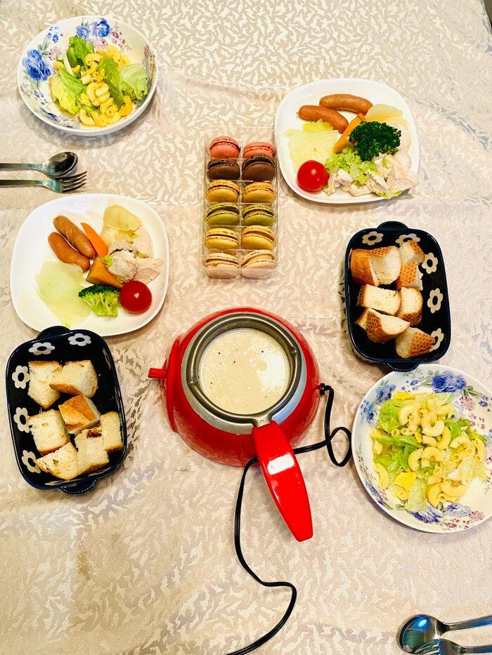 ④チーズフォンデュ用鍋に①を入れ保温しながら、②、③をフォークに刺して付けながら食べます。