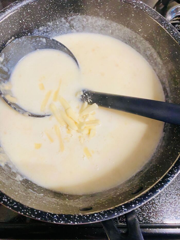 牛乳を加えよく混ぜ、ピザ用チーズを加え溶けるまで弱火でよく混ぜます。