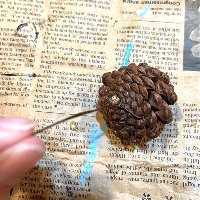 マツカサの下の方に、画像のようにググっとワイヤーを挟み込みます。