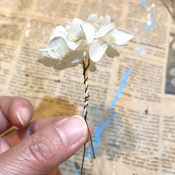 アジサイなど小さいものは適量を束ね、半分にカットしたワイヤーの中心あたりを合わせて持ち、
