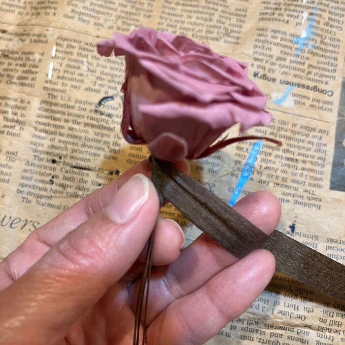 花材の茎と花材よりも下半分のワイヤーに、上半分のワイヤーを巻き付けながら巻き下ろします。