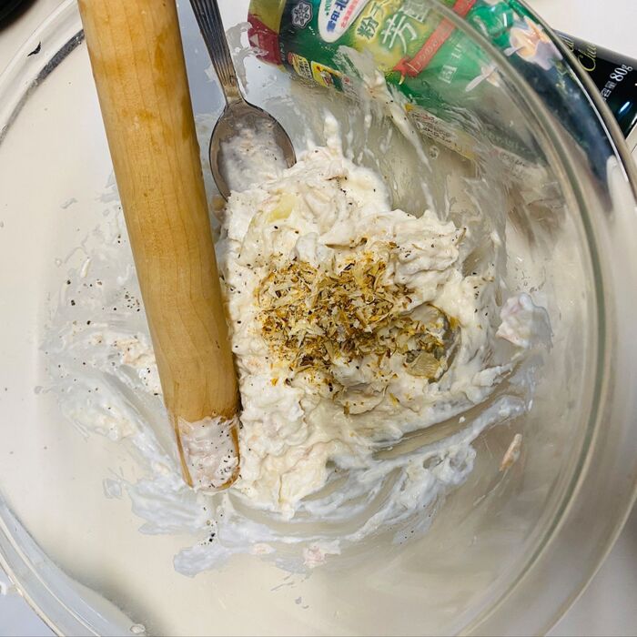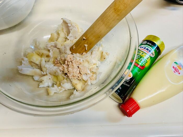 2.ツナ、マヨネーズ、パルメザンチーズを加えよく混ぜます。