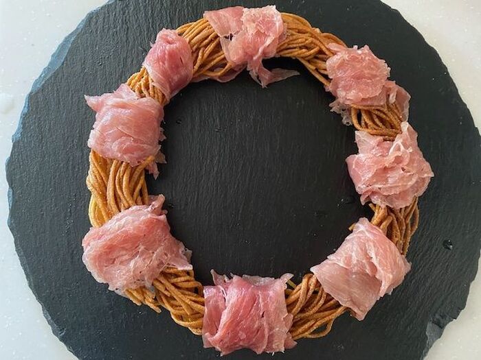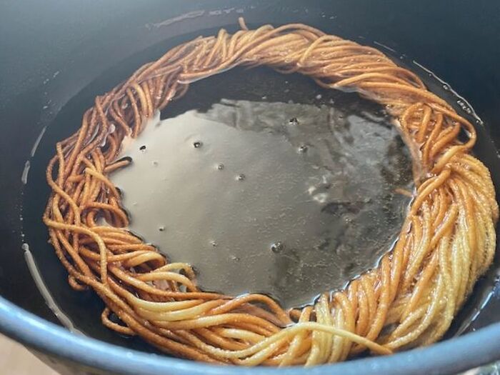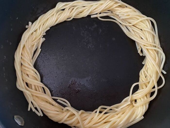 直径26cmのフライパンに茹でたスパゲッティを10本ずつぐらいねじって丸く並べていく。