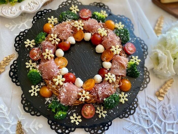飾りのプチトマトは半分に切ってブロッコリーと雪の結晶パスタは茹でて、プチモッツァレッラは水気を切って飾り、 粉チーズをふる。
