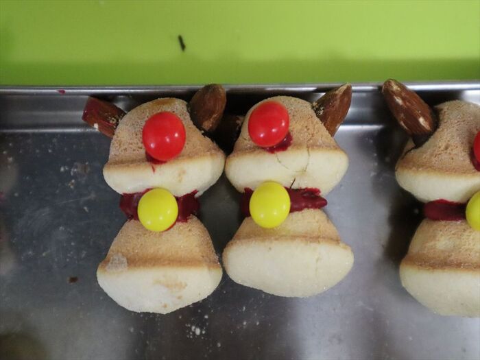 つなぎ目に赤いチョコペンを絞り、チョコ菓子(黄)を真ん中につけ、チョコ菓子(赤)を鼻の位置に貼りつけ冷蔵庫で冷やし固めます。