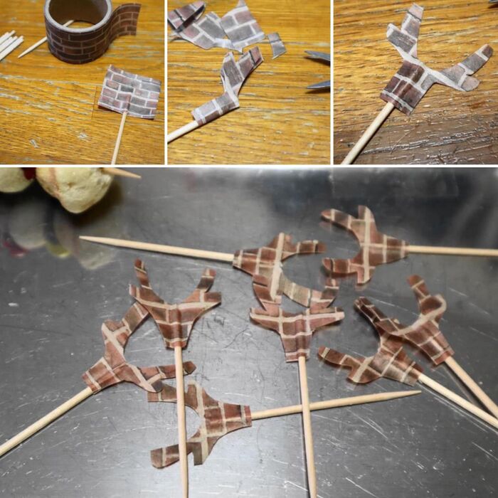 角はチョコレートやお菓子を利用して作ることもできますが、ちょっと面倒なので今回はマスキングテープと爪楊枝で作ります。