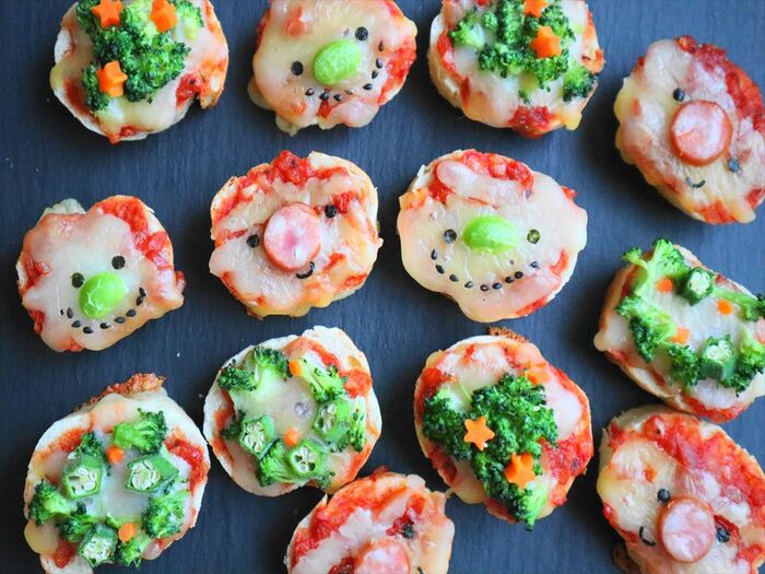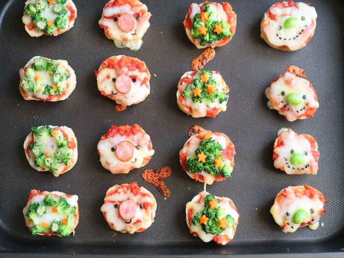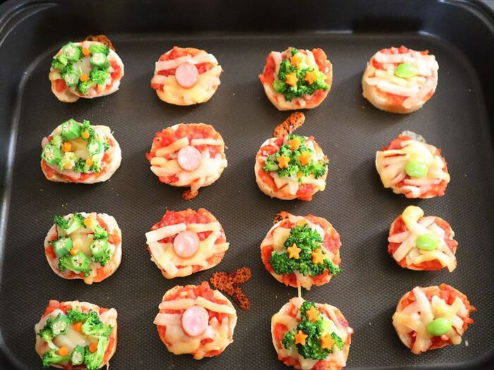 まずはスイッチを付けずにホットプレートにバケットを並べ、ピザソースを塗ります。デコに合わせてチーズをのせていきましょう。サンタっぽくしたいピザはチーズは下半分にだけ。