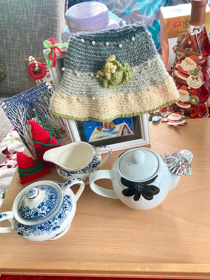 友人は遅刻の常習犯です。連絡が入って、待たされることも多いので、ポットに入ったお茶が冷めないように、毛糸のティーコゼーは優秀ですよ。
