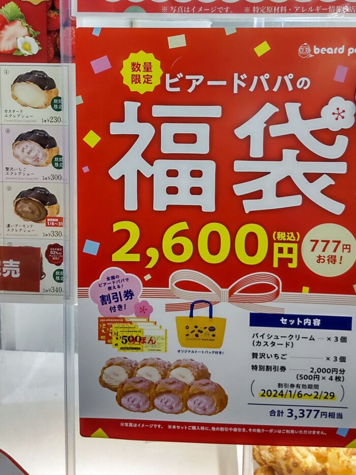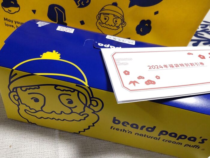 こちらは、1月3日の日のおやつにした、ビアードパパさんの2024年の福袋です。