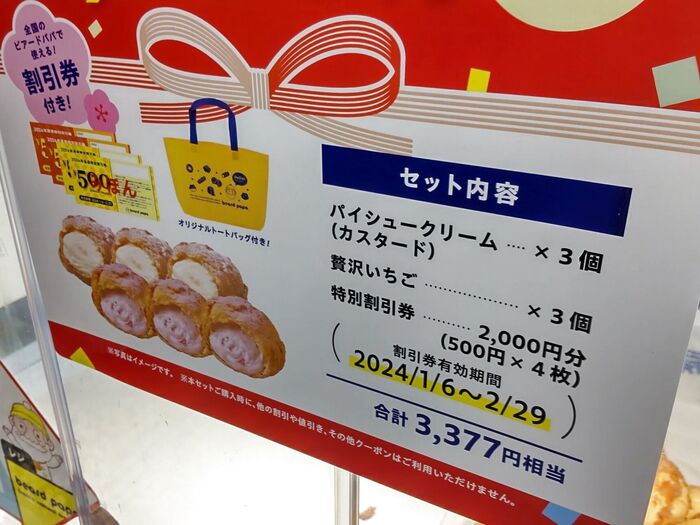 シュークリーム2種類が6個入りと特別割引券500円×4枚入りです。