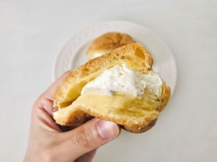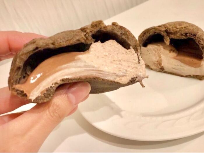 ココア味のシュー皮に、ミルクチョコクリーム(バレンシアオレンジ果汁入り)&スイートチョコカスタードクリーム(チョコクリーム入り)。