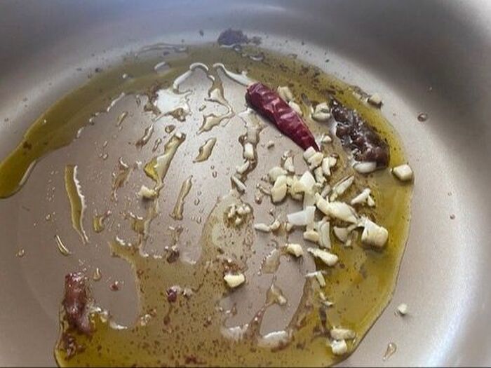 みじん切りにしたにんにく、赤唐辛子を加え、