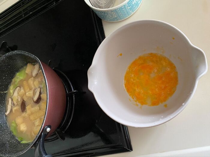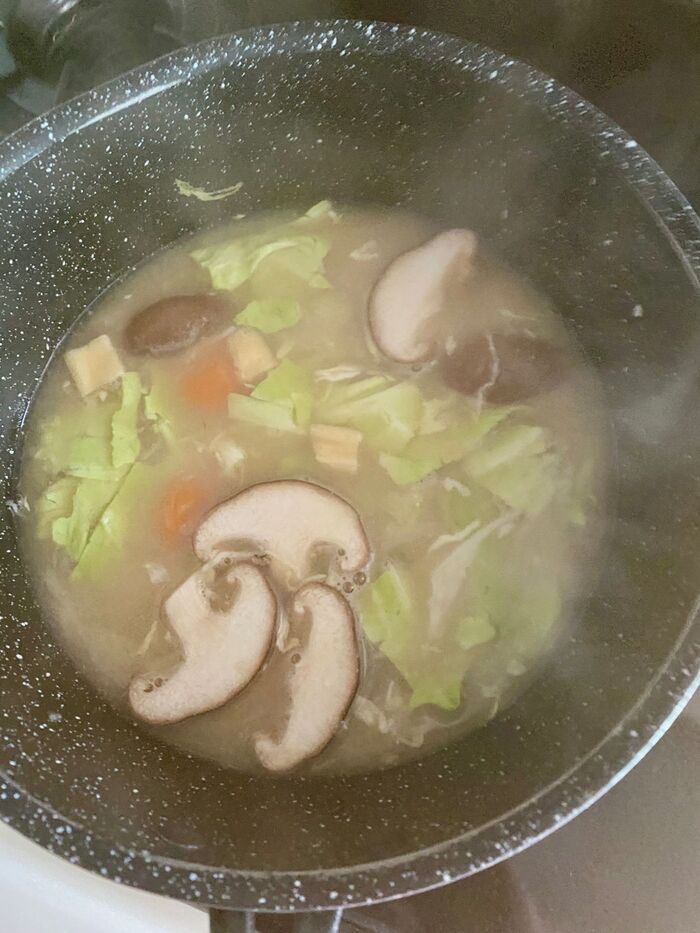 鍋に出汁を入れ短冊切りにした人参、スライス切りにした椎茸、キャベツ、賽の目切りにした油揚げ、えびを入れ火にかけます。