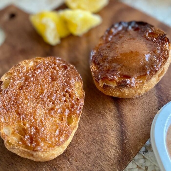 6枚切りの食パンをおすすめしていましたが、ミニフランスを半分に切ってカリッと焼いてから、このバターをたっぷり塗って、トースターで再び焼きました。