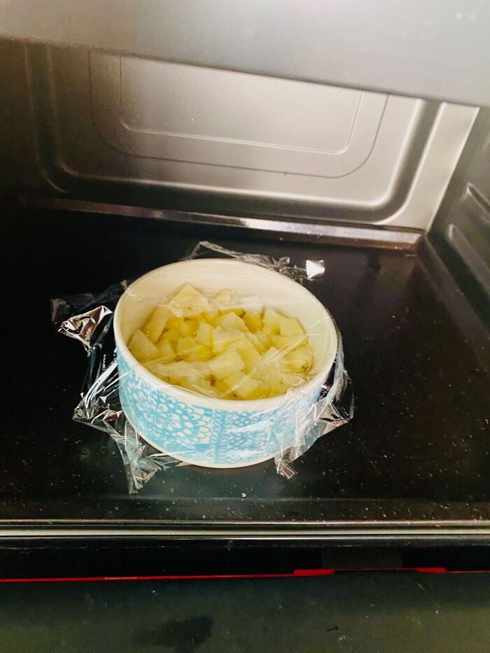 ②水気を切り、耐熱容器に入れて、レモン果汁、砂糖を入れてよく混ぜ、2分30秒ぐらいレンチンします。