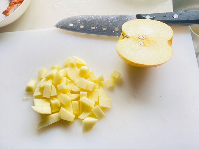 ①りんごは皮を剥き賽の目切りにして塩水に浸します。